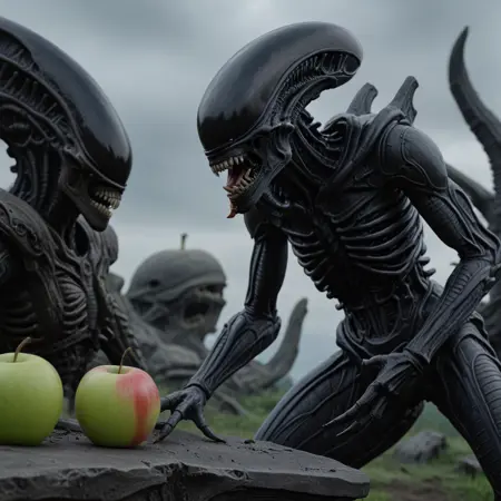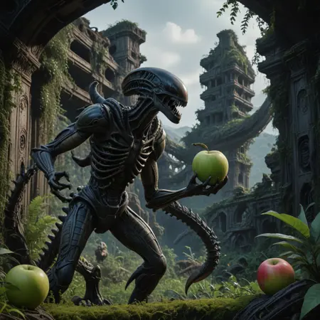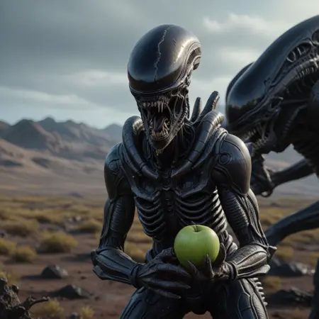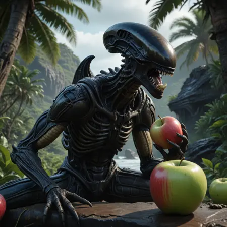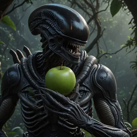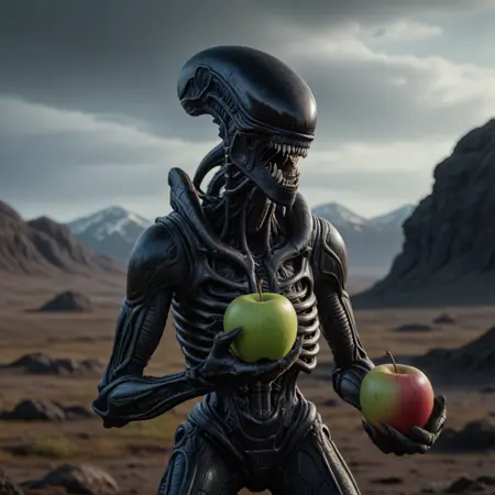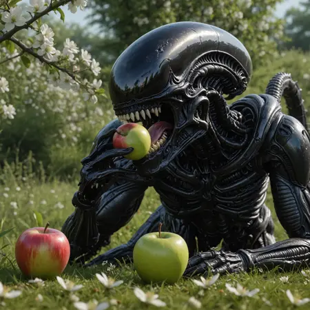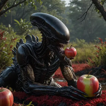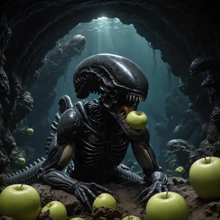 Panasonic Lumix GH5 II, Nikon NIKKOR Z 50mm f/1.2 S, flat lighting, infrared photography, daylight exposure, deep depth of field, underwater photography, Bird's-Eye View, Long shot side view, Extreme Close-Up Shot, photograph of a red apple hanging in a tree,