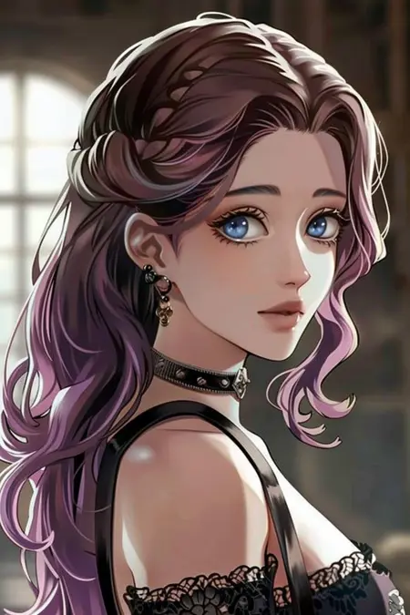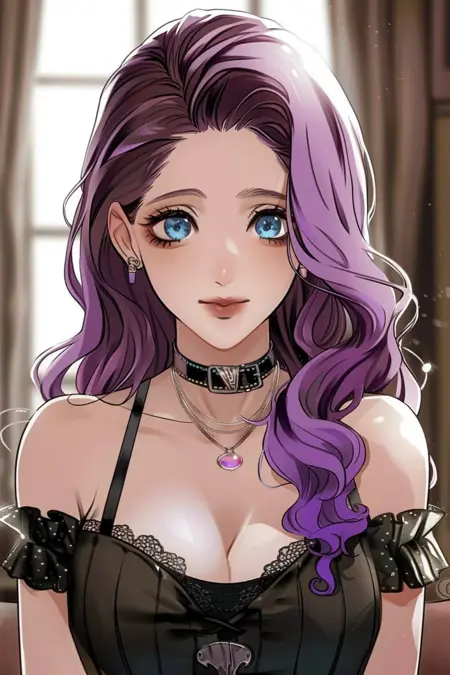 AbigailSV, purple hair, wavy hair, blue eyes, black collar