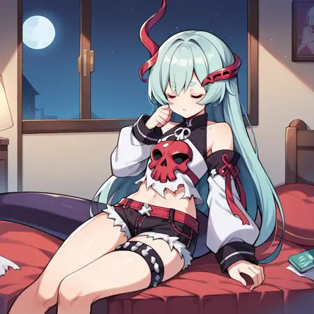 RozLil, Fol003, Rzl_Bes, long hair, aqua hair, purple eyes, thick eyebrows, mechanical horns, alternate single horn, thick eyebrows, off-shoulder shirt, alt white shirt, magenta skull, torn shirt, layered shirt, zipper top, halter shirt, zipper pull tab, turtleneck, bare shoulders, torn sleeves, white puffy sleeves, alternate gloves, alternative black gloves, bandaged head, fur-trimmed shorts, different black shorts, denim shorts, magenta belt, buckle, thigh strap, waist pouch,