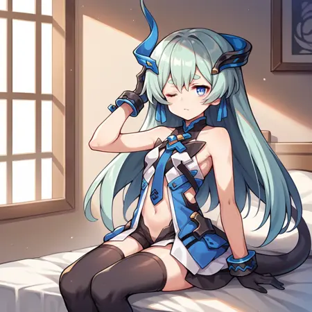 Liliya, long hair, tail, blue hair, thick eyebrows, single horn, asymmetrical horns,