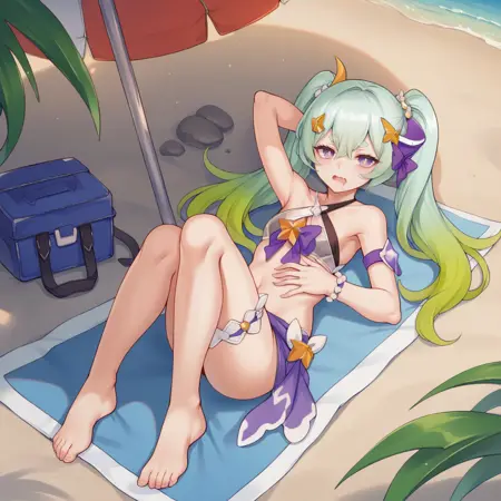 RozLil, Fol003, Rzl_Wav, long hair, aqua hair, purple eyes, thick eyebrows, layered bikini, alternative single horn, horn hair ornament, black bikini, see-through bikini, criss-cross halter, white flower, two-tone bow, white bow, purple bow, purple sarong, gold star (symbol), alt chest bow, purple armband, frilled bikini, bead bracelet, star hair ornament, twintails, gradient hair, thigh garter, midriff,