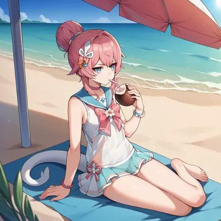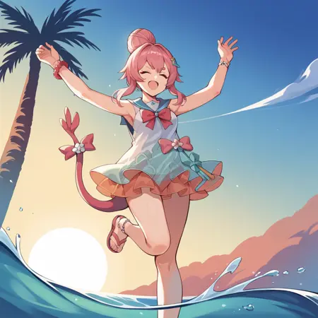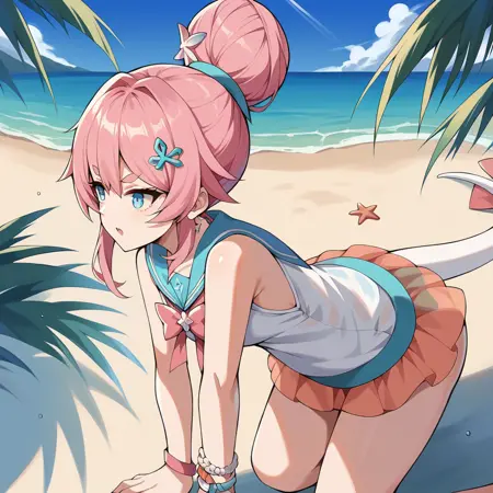 RozLil, Fol001, Rzl_Cor, blue eyes, pink hair, thick eyebrows, pink long ribbon, alt chest bow, ribbon bow, sundress, gradient skirt, see-through skirt, sailor dress, light blue sailor collar, white top, white bikini bottom, bikini bottom only, pink o-ring chocker, bracelets, single hair bun, coral hair ornament,