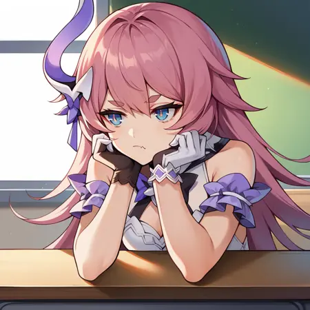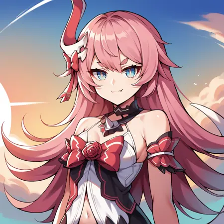 Delta, black horns, horns, ponytail, long hair, pink hair, streaked hair, blue hair, mechanical tail,