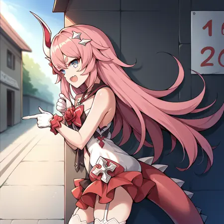 Rozaliya, long hair, tail, pink hair, thick eyebrows, single horn, asymmetrical horns,