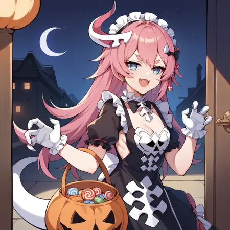 RozLil, Fol001, Rzl_Goh, blue eyes, long hair, pink hair, thick eyebrows, halloween costume, white skull, bones, straped dress, alt black dress, layered skirt, detached collar, frilled collar, magenta bowtie, frilled headdress, hair ornament, alt magenta bow, puffy short sleeves, black frilled sleeves, sideboob cutout, frills, black frilled wrist cuffs, gloves, white gloves, thighband pantyhose, white pantyhose, strappy heels, frilled anklet
