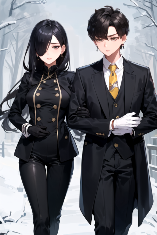 | 训练词汇 | (KeiwaKR, 1boy, short hair, black hair), (RitaSS, 1girl, long hair, covered mouth, parted bangs, medium breasts), man and woman, hetero 已复制! (KeiwaKR, 1boy, short hair, black hair, long sleeves, yellow necktie, black jacket, formal), (RitaSS, 1girl, long hair, covered mouth, parted bangs, black gloves, earring, hair over one eye, black coat, buttons, medium breasts, ), black pants, man and woman, hetero已复制! |