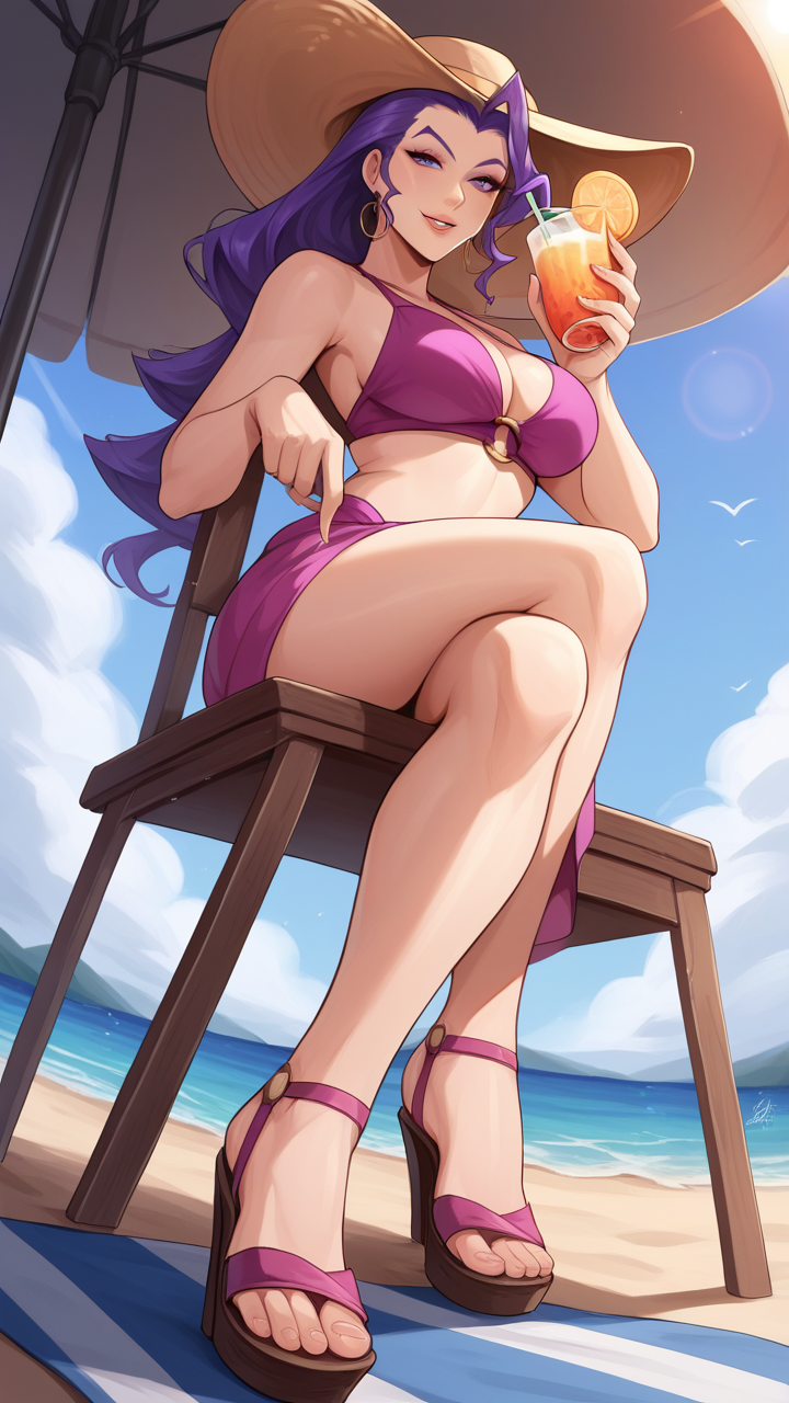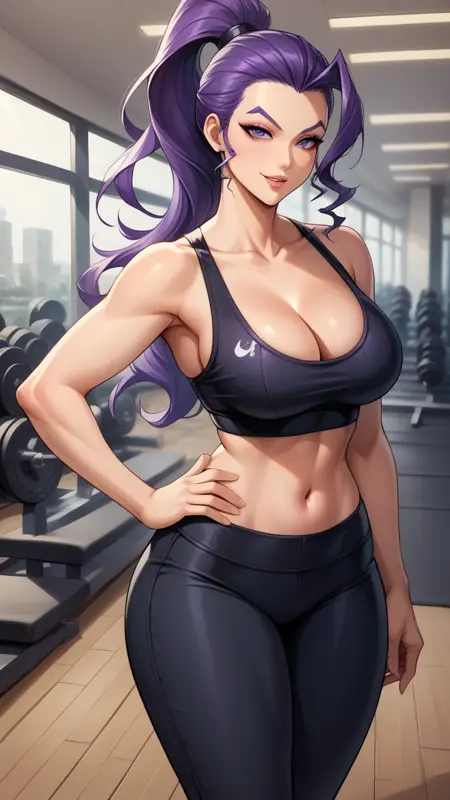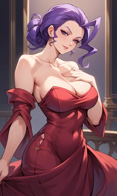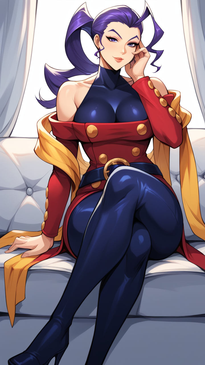 "RoseSF,紫色头发,紫色眼睛,天线发,单股发丝,高领,头发向后梳,裸露肩膀,黄色披肩,红色夹克,腰带,紫色紧身裤"