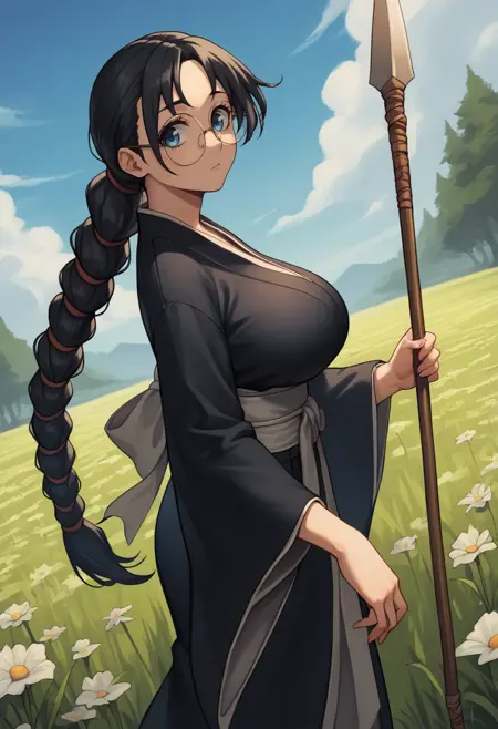 Outfit: ["batsuunsai, black hair, low ponytail, braided ponytail, long hair, blue eyes, black kimono, white haori, white sash, wide sleeves, round eyewear"]