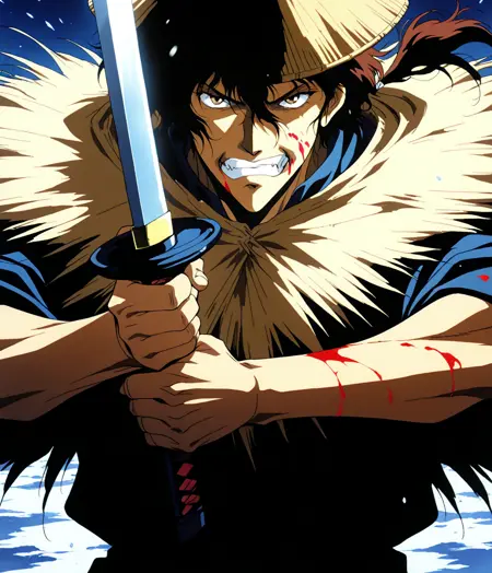 朱兵 - (1boy, solo, male focus, 深色皮肤, 棕色眼睛, 睫毛, 头发遮眼, 嘴唇 (负向:红色嘴唇), 阳刚, 棕色头发, 马尾, 和服, 持武器, 持刀, 太刀, 帽子, 阿修罗笠, 武士), 战斗姿势, 战斗场景, 张口, 牙齿, 紧咬牙关 (可加入:完好牙齿 - 如需)