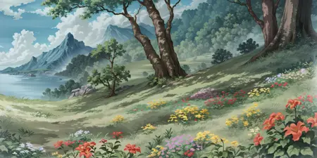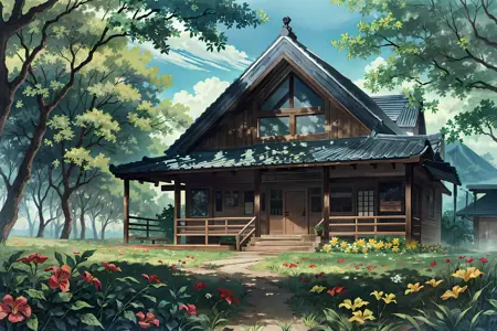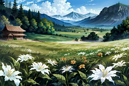 no humans, scenery, indoors, outdoors, grass, valley, snow, desert, moon, building, architecture, east asian architecture, water (also include: Inverted reflection), sky, cloud, bloom (can help for the overall style), fireflies, field, flowers, tree, waterfall, plant, star (sky), wooden floor, mountain, fantasy setting, landscape, etc.
