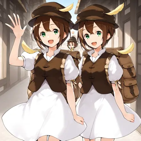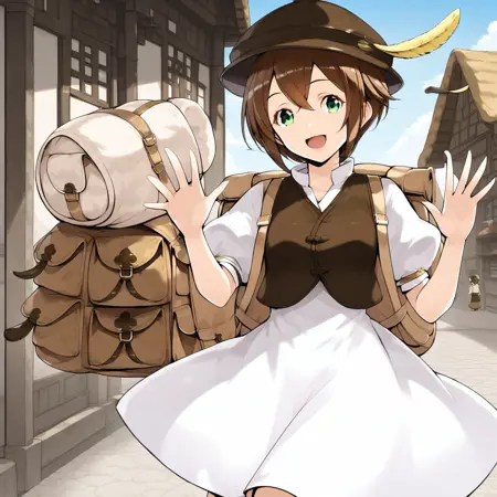 tressa, hat feather, white dress, backpack, boots, microdress, plain dress, short hair, brown hair, brown boots, yellow feather, green eyes, pointed sidelocks, puffy short sleeves, dark brown vest over dress, standing, smile, open mouth, small vest, brown hat, small hat,