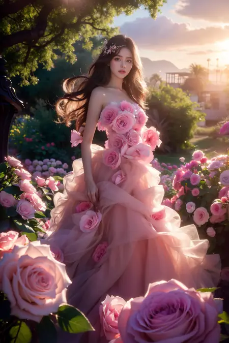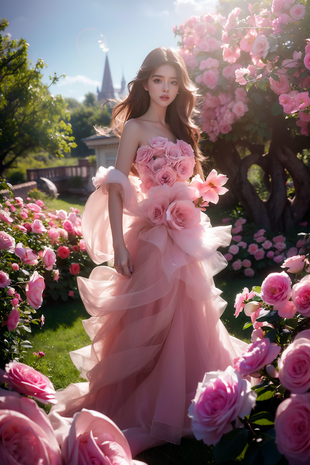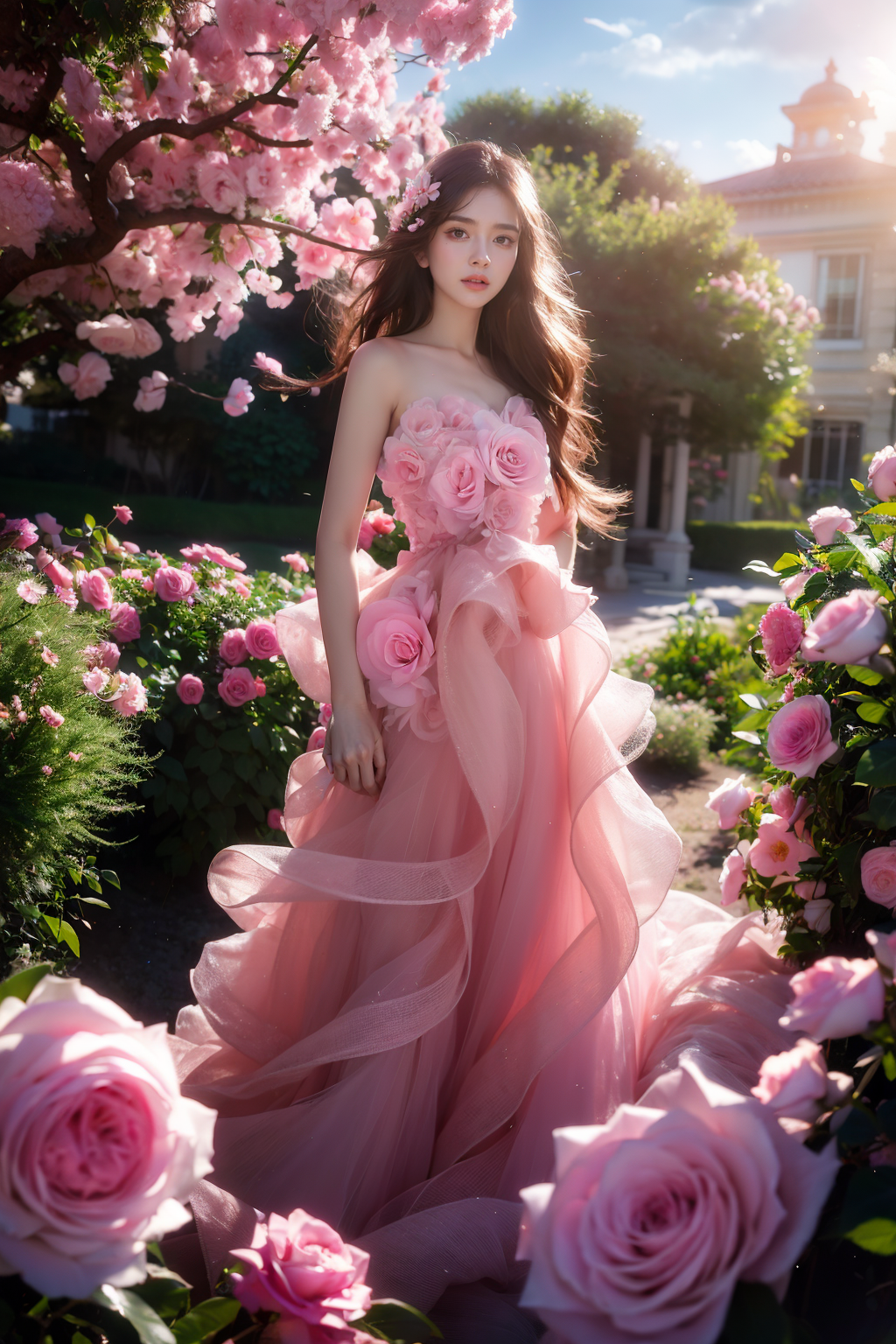 Prompt: photorealistic,realistic,photography,masterpiece,best quality,ultra-detailed,extremely detailed CG unity 8k,1girl,solo,long hair,blonde hair,dress,bare shoulders,standing,full body,flower,outdoors,from side,tree,pink flower,pink rose