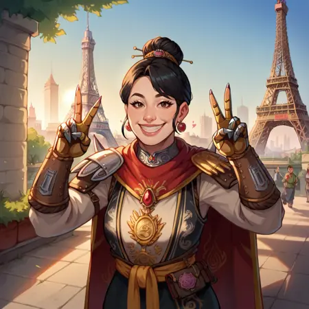Shugengan, 1girl, black hair, bun, armor, gauntlets,