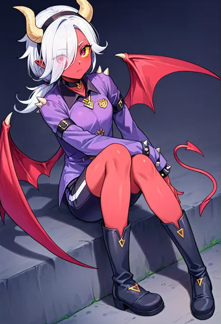trixie colette, 1girl, solo, demon girl, colored skin, red skin, red eyes, colored sclera, yellow sclera, hairband, demon horns, ponytail, short hair, white hair, hair over one eye, demon wings, demon tail, spiked choker, shirt, spikes, arm belt, spiked bracelet, long sleeves, sleeves past fingers, sleeves past wrists, shorts, boots, knee boots