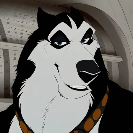 male focus, husky, male husky, smiling expression, looking at viewer, big black lip, canine lip, head shot, black and white fur, white snout, white face, black shoulders, black back, white chest, big collar, thick collar, studded collar, brass buckle, blue eyes 1boi, solo