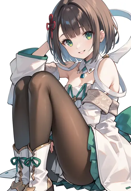 标签(服装):白色连衣裙,白色分离袖子,白色分离领子,红色发饰,黑色连裤袜,白色膝靴