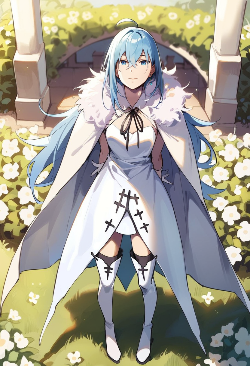 If you want to try to recreate Vivy's outfit from the animation, you can use the following prompts: "white gloves, gloves, closed mouth, boots, cape, thigh boots, white footwear, thighhighs, fur trim, cape, ribbon, dress, black ribbon, white cape, fur trim, neck ribbon, white dress" (not necessarily effective).