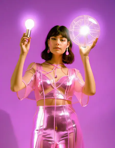 • a photo of a woman in a pink dress holding a light up in the style of dana-trippe