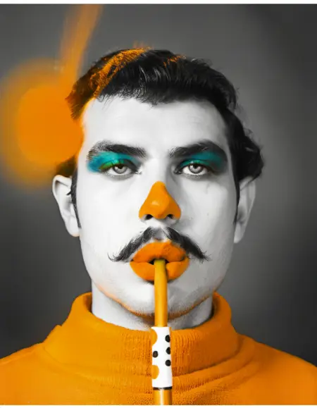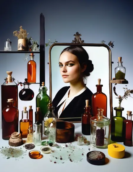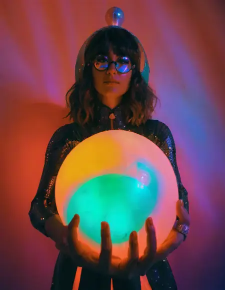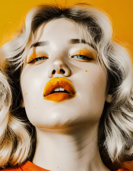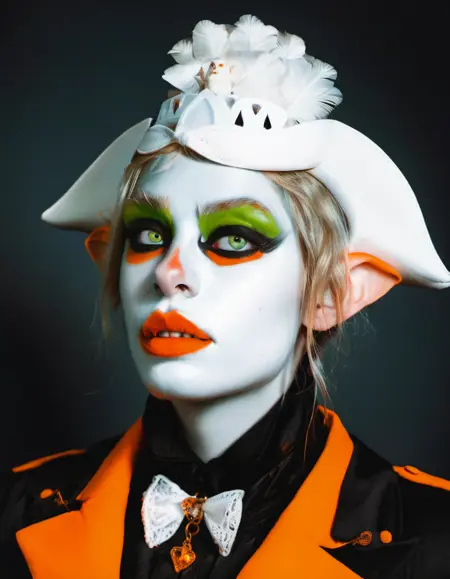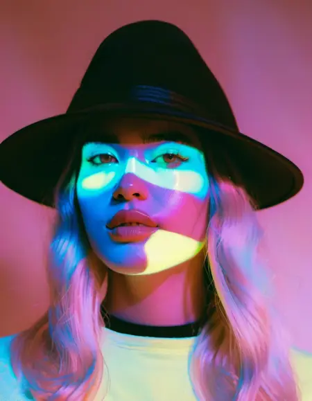 • a photo of a woman with a glowing face and a black hat in the style of dana-trippe