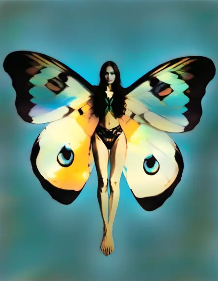 • a photo of a woman with butterfly wing with a long body in the style of dana-trippe