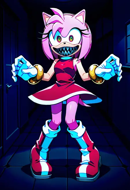 PossesedAmyFNF, 1girl, purple and yellow yes, multicolored eyes, black sharp teeth, pink fur, pink hair, animal ears, animal nose, white gloves, gloves, gold bracelets, red dress, red white striped boots, sleeveless, red headband, pink tail, horror, amy rose,
