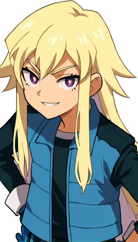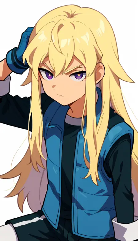 gloves, blue sleeveless jacket, black long sleeves, shorts, white leggings under shorts