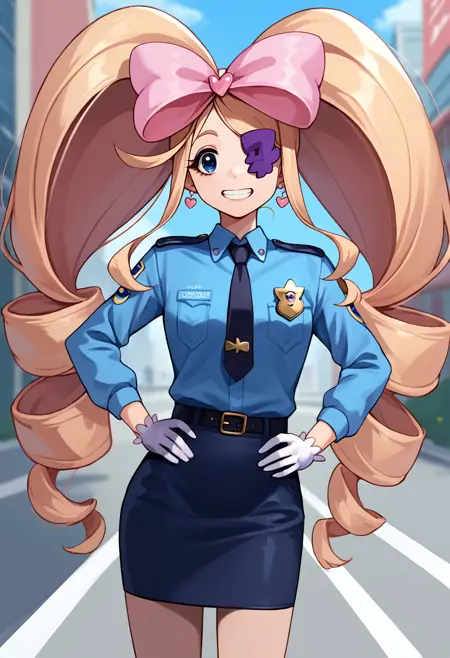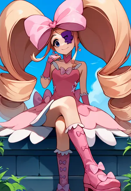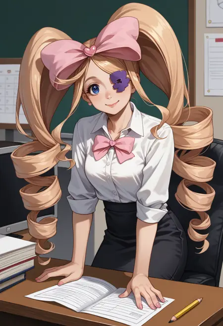 트리거 + 외모: harime nui, 큰 머리카락, 트윈 드릴, 머리 리본, 분홍 리본, 거대한 리본, 안대