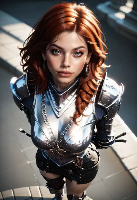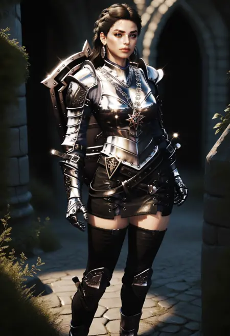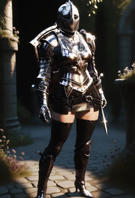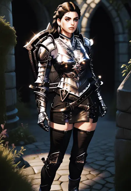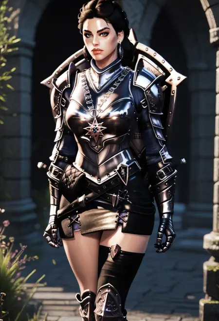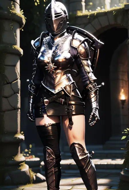 Primary: d4rkkn1ght, armor, gauntlets, skirt, single thighhigh, boots, earrings, shield:shield on back,