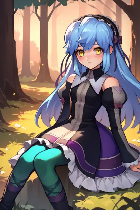 添加 "发带、黑色连衣裙、脱袖、绿色连裤袜、靴子" 以呈现她的典型造型。