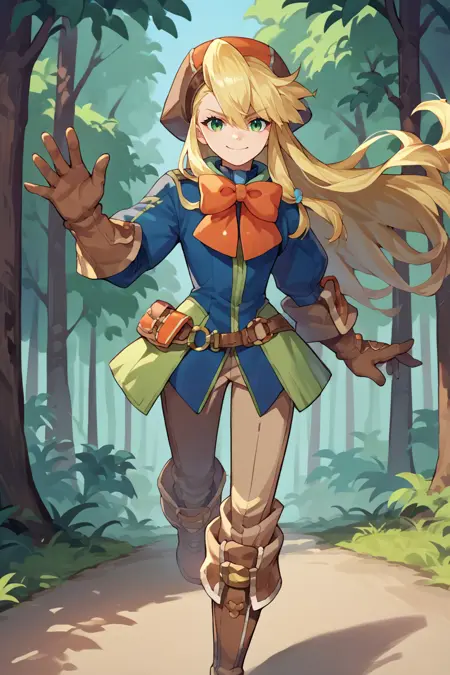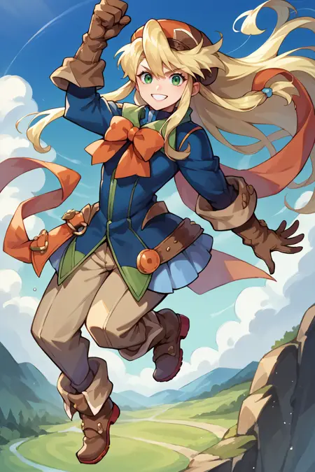 彼女の最初の衣装には、「hat, long hair, blue uniform, red bow, brown gloves, belt, brown pants, boots」を追加してください。