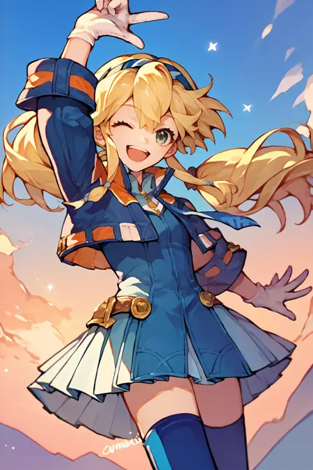 最後の衣装には、「hairband, twintails, blue jacket, white gloves, pleated skirt, blue thighhighs」を追加してください。