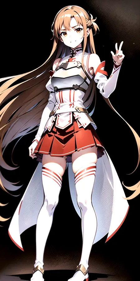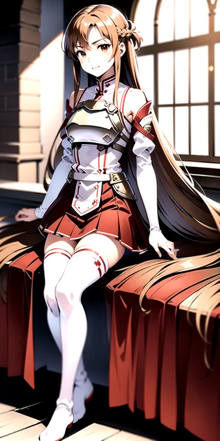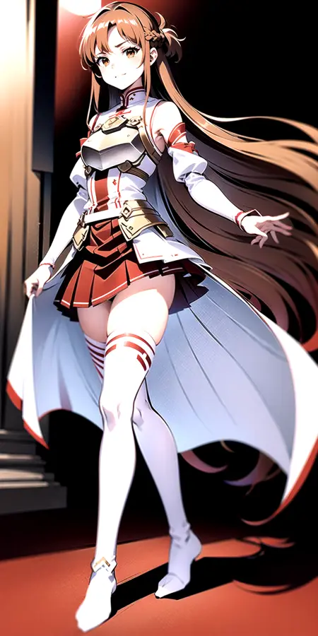 推奨タグ:(asuna_first_uniform:1.4),1girl,full body,red pleated skirt,lora:asunafirstuniform:1.tall body, tall, long legs, indoors, long hair, brown hair, brown eyes, solo, thighhighs, smile, armor, breastplate, detached sleeves, looking at viewer, bare shoulders,very long hair