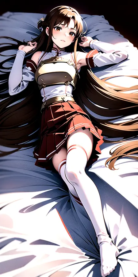 推荐标签:(asuna_first_uniform:1.4),1girl,full body,red pleated skirt,lora:asunafirstuniform:1.tall body, tall, long legs, indoors, long hair, brown hair, brown eyes, solo, thighhighs, smile, armor, breastplate, detached sleeves, looking at viewer, bare shoulders,very long hair