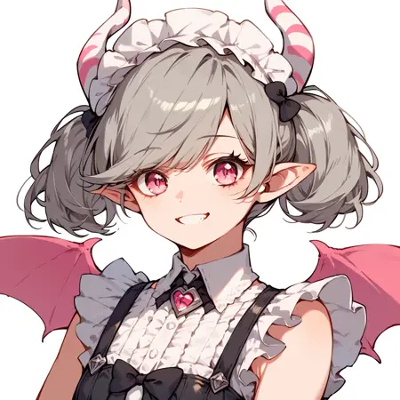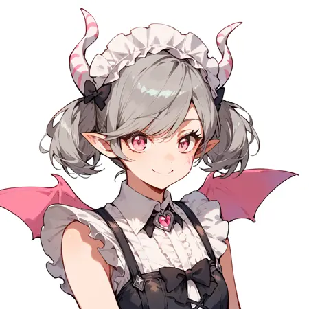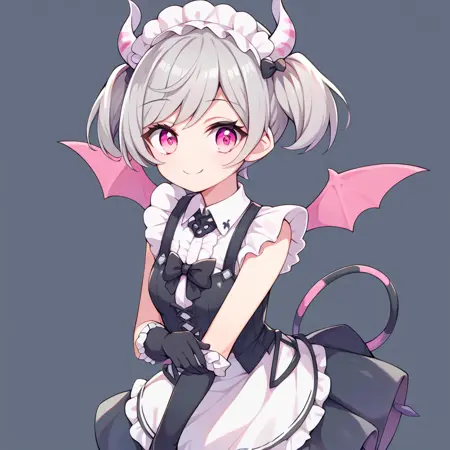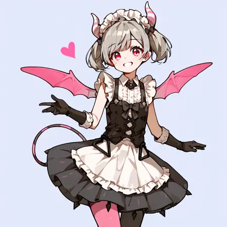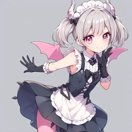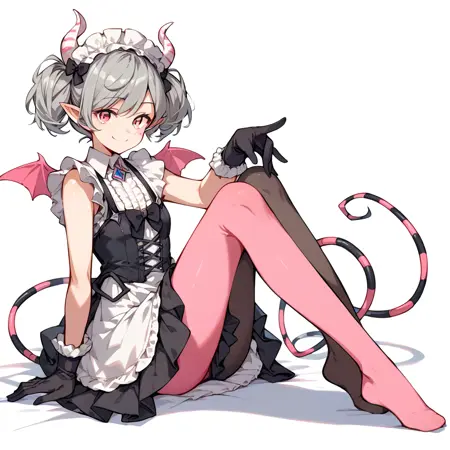 1girl, solo, ariane, grey hair, short twintails, pink eyes, maid headdress, horns, mini wings, pantyhose, gloves, pointy ears