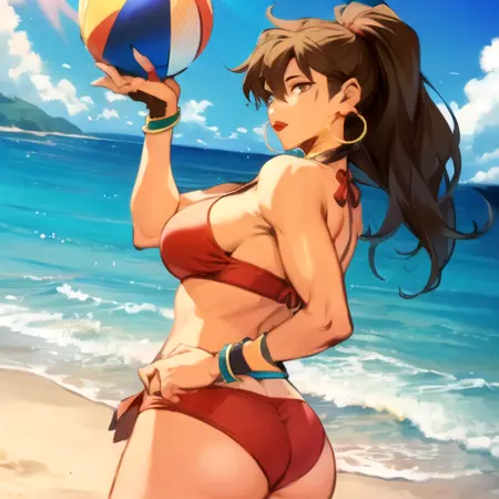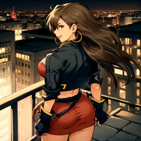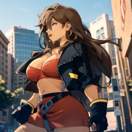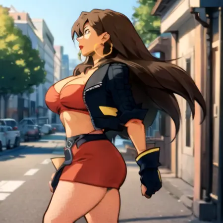 Default: Blaze Fielding, brown hair, long hair, brown eyes, red miniskirt, red tube top, black leather jacket, 1girl, solo, breasts, large breasts, cleavage, jewelry, earrings, black gloves, midriff, belt, open jacket, strapless, makeup, red skirt, lipstick, red boots, hoop earrings,