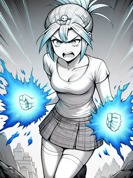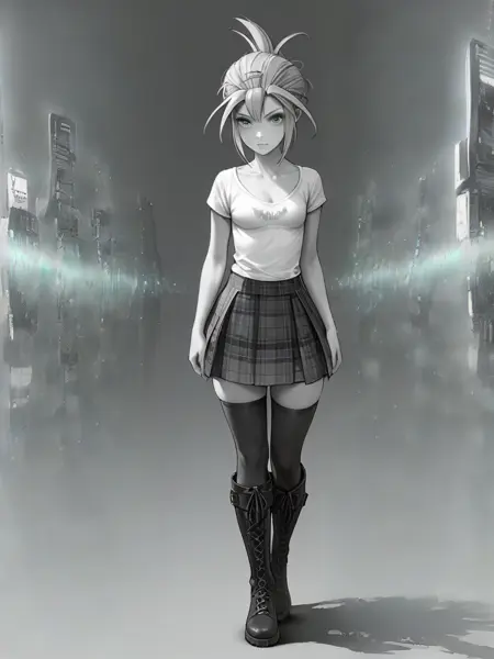 talia, hairclip, pale skin, t-shirt, small breasts, cleavage, plaid skirt, white thighhighs, black tall boots