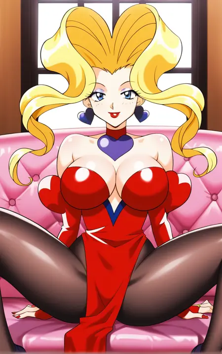 red leotard, cleavage, heart, heart earrings, earrings, red dress, elbow gloves, black thighhighs, bare shoulders, red gloves, side slit, detached sleeves, fingerless gloves, pantyhose, bridal gauntlets, brooch,strapless dress,