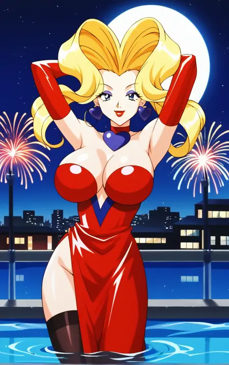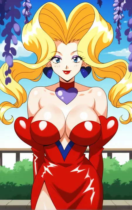 1girl, blonde hair, long hair, large breasts, jewelry, makeup, lipstick, blue eyes, choker, breasts, red lips, twintails, eyeshadow, big hair, hoop earrings, prehensile hair,