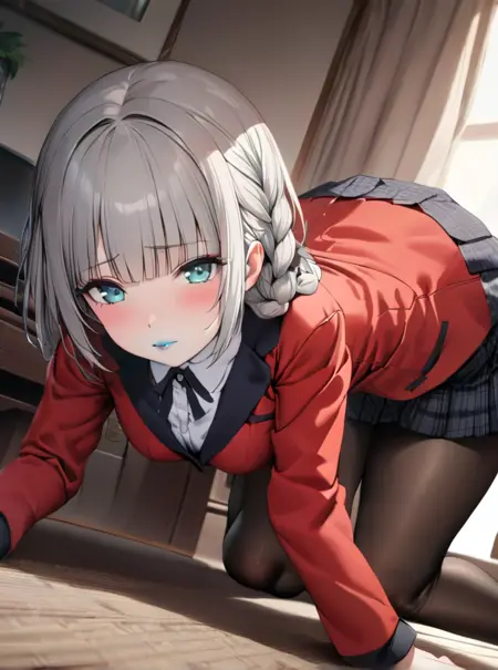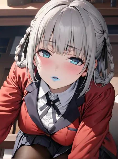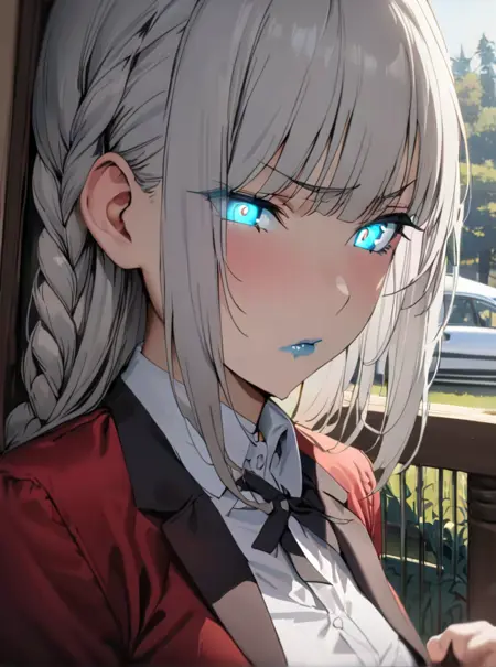 モモバミ・キラリ、青い目、青い唇、銀髪、編み上げ髪、Hyaka_学校制服、赤いジャケット、黒いパンスト、白いシャツ、黒いリボン、プリーツスカート、長袖、