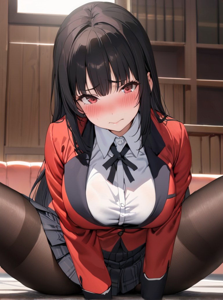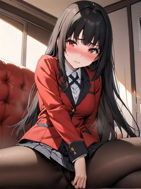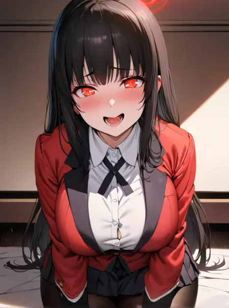 ジャバミ・ユメコ、赤い目、黒髪、長い髪、Hyaka_学校制服、赤いジャケット、黒いパンスト、白いシャツ、プリーツスカート、長袖、
