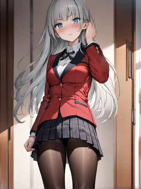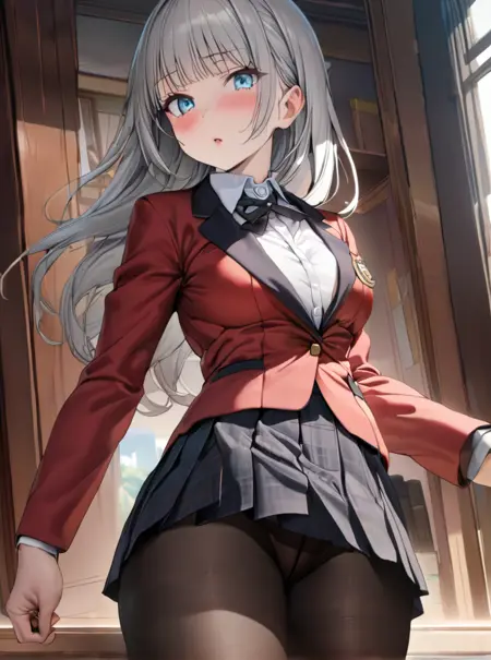 モモバミ・リリカ、青い目、銀髪、長い髪、Hyaka_学校制服、赤いジャケット、黒いパンスト、白いシャツ、プリーツスカート、長袖、