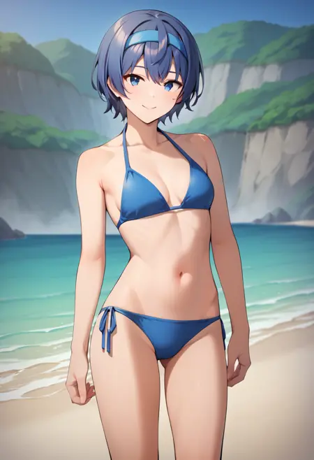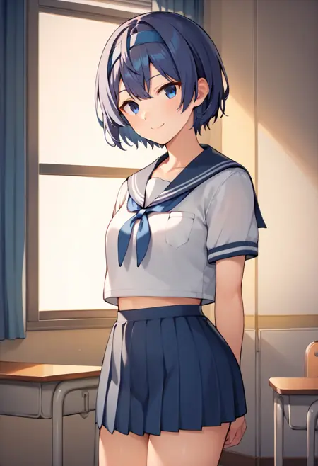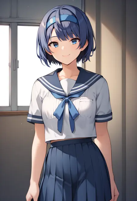 suzuki tsudumi, blue hair, short hair, hairband, blue eyes,