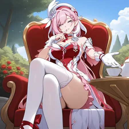 Elys, Fol002, Ely_Caf, pointy ears, long hair, low ponytail, pink hair, blue eyes, white capelet, capelet, white headwear, hat, black ascot, cleavage cutout, sleeveless dress, white dress, frilled dress, alt long skirt, alternate white skirt, detached sleeves, alternate white sleeves, sleeves past elbows, white ribbon, alternate ribbon, alt black corset, alt corset, elysia (honkai impact)