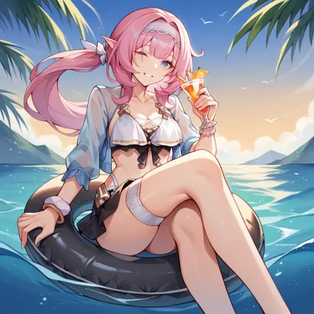 Elys, Fol001, Ely_Swm, pointy ears, long hair, pink hair, blue eyes, hairband, (breast curtains)++, halterneck, open jacket, shell necklace, cropped jacket, light blue jacket, see-through jacket, short sleeves, light blue sleeves, two-tone skirt, cleavage, panty straps, chest strap, ribbon, black ribbon, bracelet, bikini skirt, wrist scrunchie, alt jewelry, alt thigh strap, elysia (honkai impact),