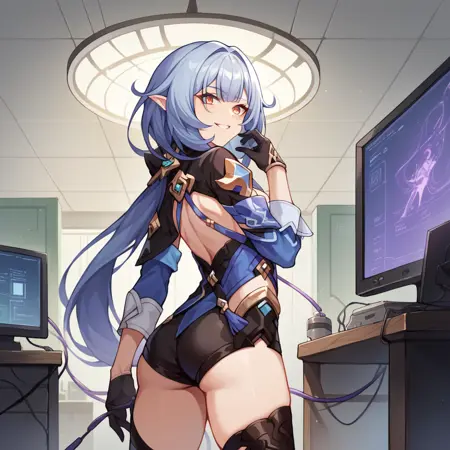 Ely_HoC, blue hair, cleavage, thigh boots, micro shorts, black shorts, two toned shirt, black shirt, blue shirt, asymmetrical sleeves, black gloves,
