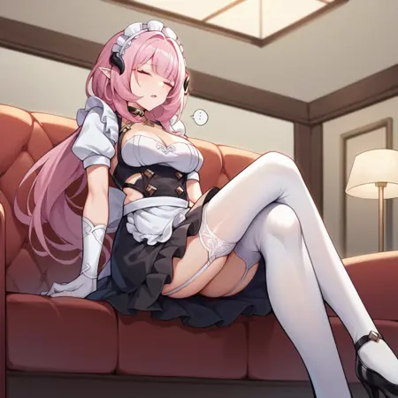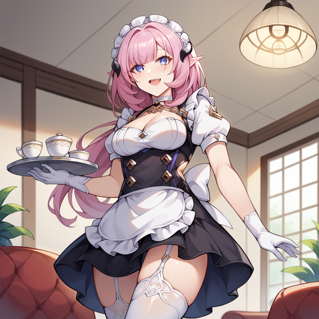 Elys, Fol001, Ely_Maid, pointy ears, long hair, pink hair, blue eyes, maid headdress, alt halterneck, white flower, enmaided, alt side cutout, clothing cutout, black corset, corset, puffy short sleeves, white sleeves, elbow gloves, white gloves, frilled skirt, black skirt, white apron, white bra, striped ribbon, black choker, white thighhighs, garter straps, elysia (honkai impact),
