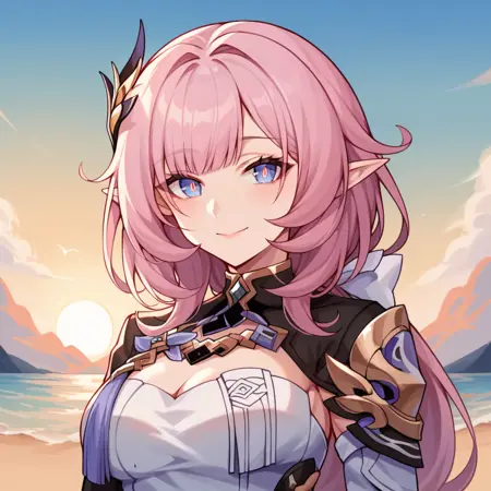 Elys, Fol002, Ely_Caf, pointy ears, long hair, low ponytail, pink hair, blue eyes, white capelet, capelet, white headwear, hat, black ascot, cleavage cutout, sleeveless dress, white dress, frilled dress, alt long skirt, alternate white skirt, detached sleeves, alternate white sleeves, sleeves past elbows, white ribbon, alternate ribbon, alt black corset, alt corset, elysia (honkai impact)
