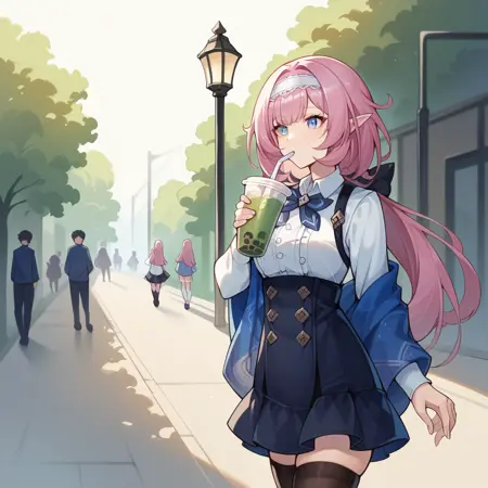 Elys, Fol001, Ely_Bte, pointy ears, long hair, low ponytail, pink hair, blue eyes, alt white shirt, collared shirt, long sleeves, alt white sleeves, blue shawl, shawl, high-waist skirt, dark blue skirt, alt frilled skirt, alt black ribbon, alt ribbon, neck ribbon, alt hairband, black thighhighs, hair ribbon, shoulder straps, elysia (honkai impact),
