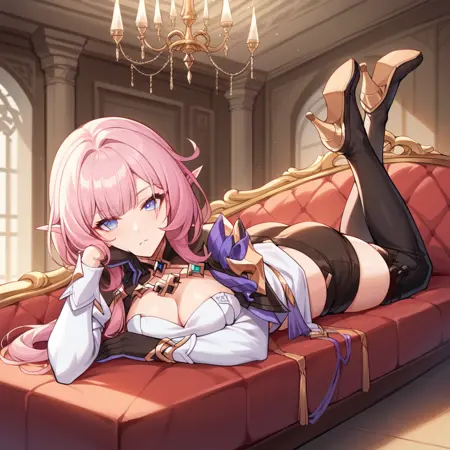 Elys, Fol001, Ely_Def, pointy ears, long hair, pink hair, blue eyes, shrug (clothing), black shrug, cleavage, jewelry, purple trim, hair ornament, asymmetrical sleeves, black sleeves, single wide sleeve, single detached sleeve, single gauntlet, white gauntlet, single pauldron, asymmetrical clothes, short shorts, black shorts, side cutout, white skirt, long skirt, open skirt, purple skirt, thigh strap, single glove, black footwear, black glove, black thigh boots, low ponytail, elysia (honkai impact),
