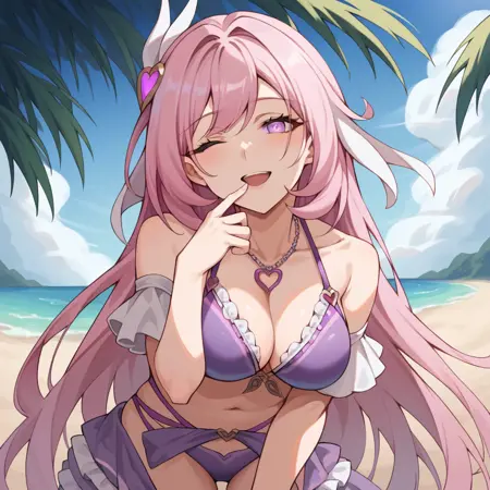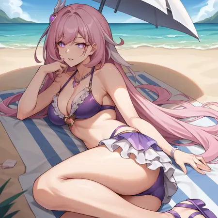 Elys, Fol003, Ely_Bik, long hair, pink hair, pointy ears, purple eyes, alt pink ribbon, alternative ribbon, white streaked hair, frilled bikini, purple bikini, alt shawl, white shawl, frilled shawl, criss-cross halter, heart necklace, alt heart hair ornament, wristband, elysia (honkai impact),